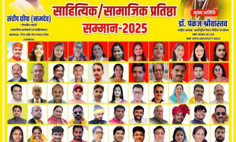 दौसा। शिव शक्ति सेवा संस्थान, दौसा द्वारा वर्चुअल सम्मान समारोह का आयोजन किया गया। इस अवसर पर विभिन्न क्षेत्रों में उल्लेखनीय योगदान देने वाले 71 व्यक्तित्वों को सम्मानित किया गया। ज्ञान-संदीप आदर्श साहित्यिक/सामाजिक प्रतिष्ठा सम्मान 2025 से सम्मानित किया गया,गूगल मीट के माध्यम से,समारोह के मुख्य अतिथि रियल मीडिया फाउंडेशन के राष्ट्रीय अध्यक्ष डॉ.पंकज श्रीवास्तव,धरा धाम इंटरनेशनल फाउंडेशन के संस्थापक डॉ.सौरभ जी पांडे,जैन मुनि लोकेश जी महाराज रहे,जिन्होंने सभी प्रतिभागियों को शुभकामनाएँ देते हुए कहा कि समाज में सेवा,समर्पण और सकारात्मक सोच के बिना प्रगति संभव नहीं है।